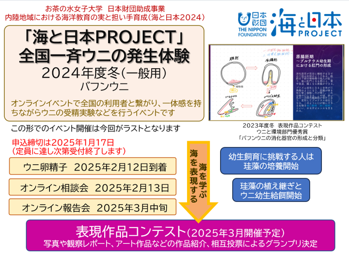 お茶の水女子大学湾岸教育研究所は、2025年2月に「全国一斉ウニの発生体験2024年度冬」の教材提供を行います。同じ親ウニから採取した未受精...