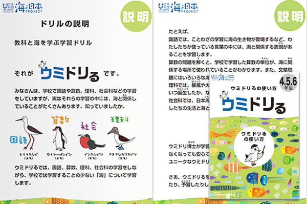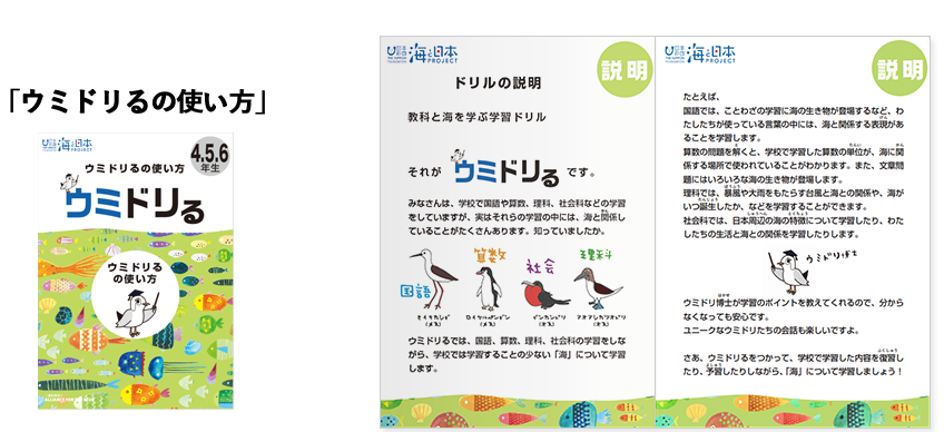 教科と海を学ぶ学習ドリル「ウミドリる」は、国語、算数、理科、社会の四教科と一緒に海のことも学べる「学習用ドリル」です。 ウミドリ(海鳥)が各教科を面白く、楽しく案内します。各教科をそれぞれ1ページずつ(計4ページ/日)、頑張って2週間続けると、四教科に加えて海のことも学べる「一石二鳥ならぬ、一石五鳥」の優れものです。 小学校4、5、6年生のみんな! 家族と一緒にぜひチャレンジしてくださいね。
